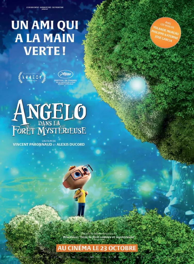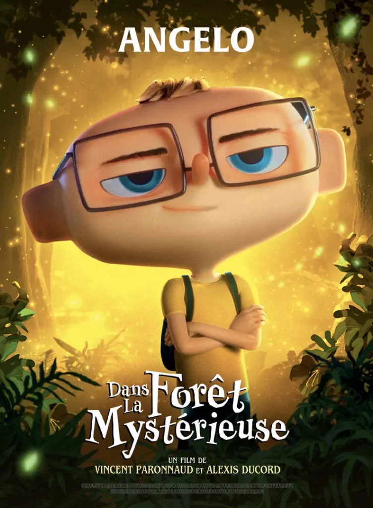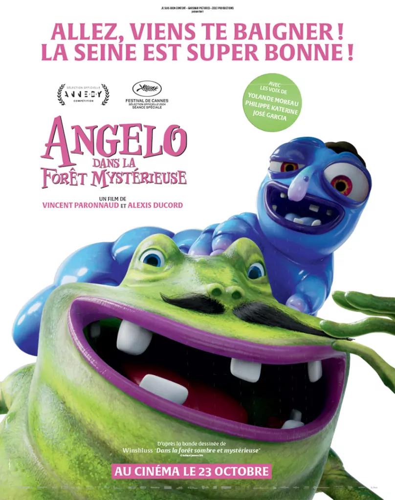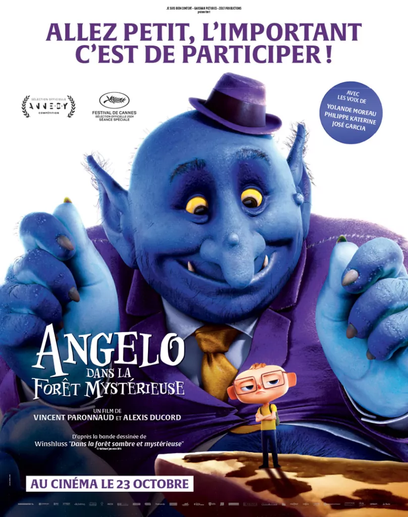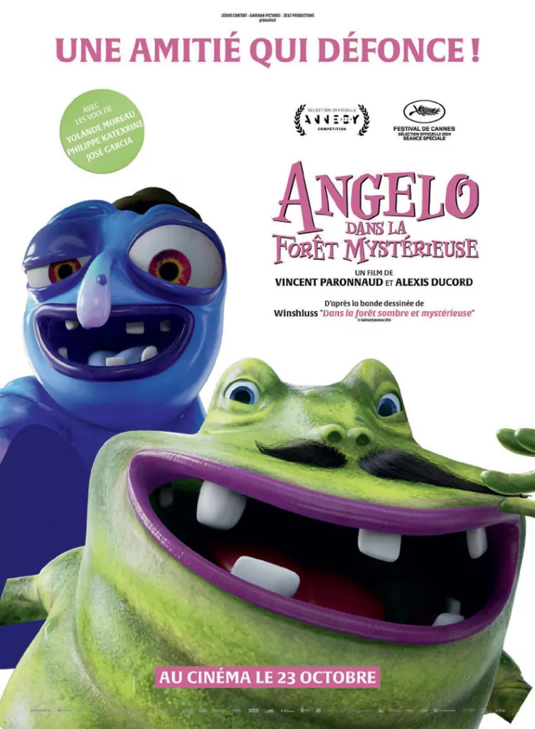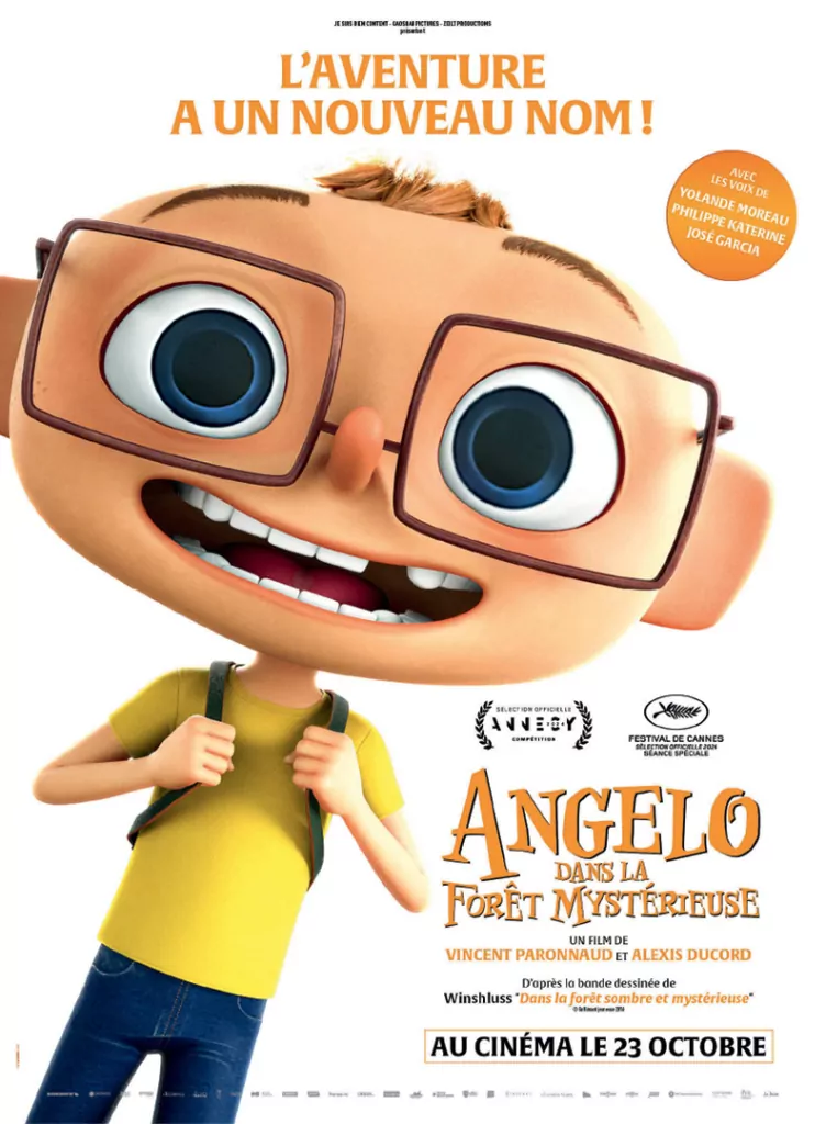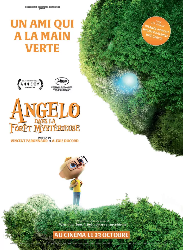 Affiche cinéma officielle du film d'animation "Angelo dans la forêt mystérieuse". Une affiche créé par l'agence Les Aliens. Un film adapté de la bande dessinée DANS LA FORÊT SOMBRE ET MYSTÉRIEUSE de Winshluss. Distribution du film en France par Le Pacte en octobre 2024.