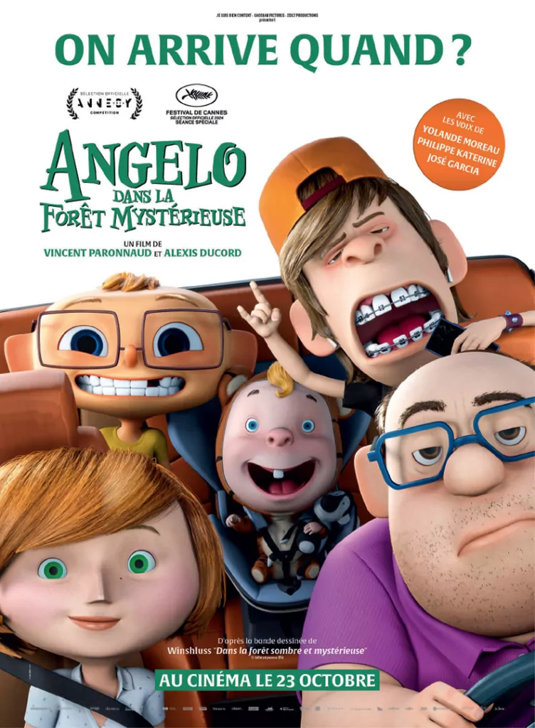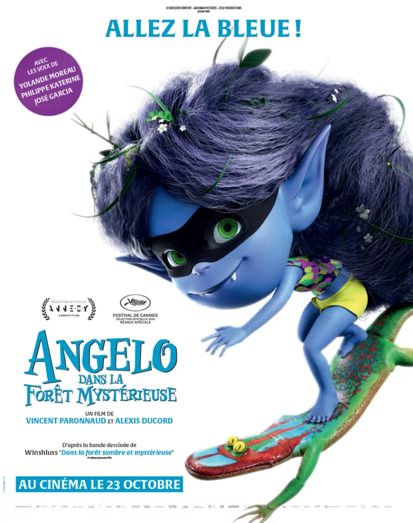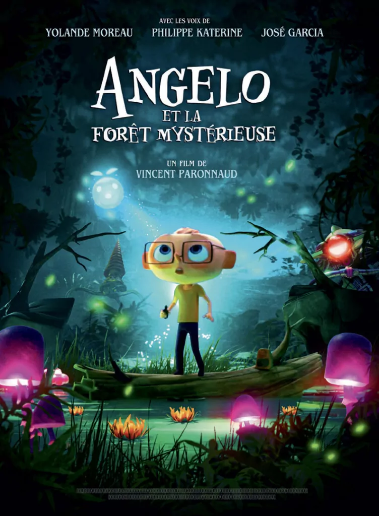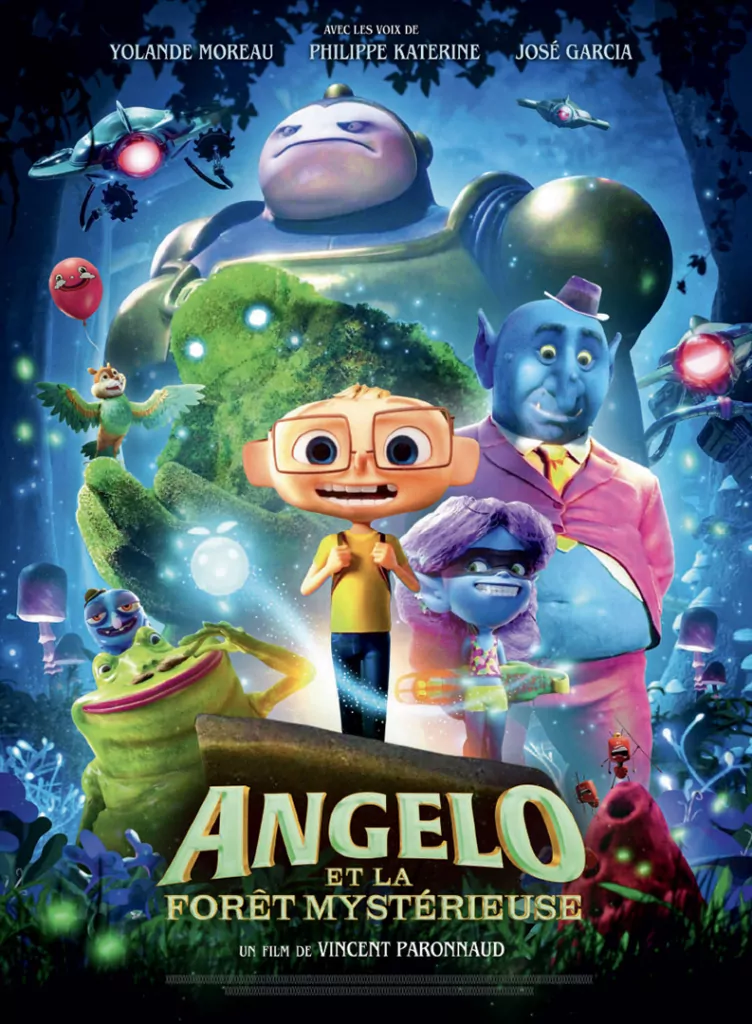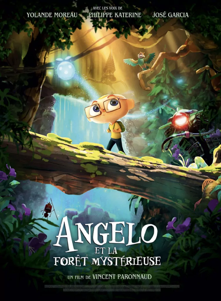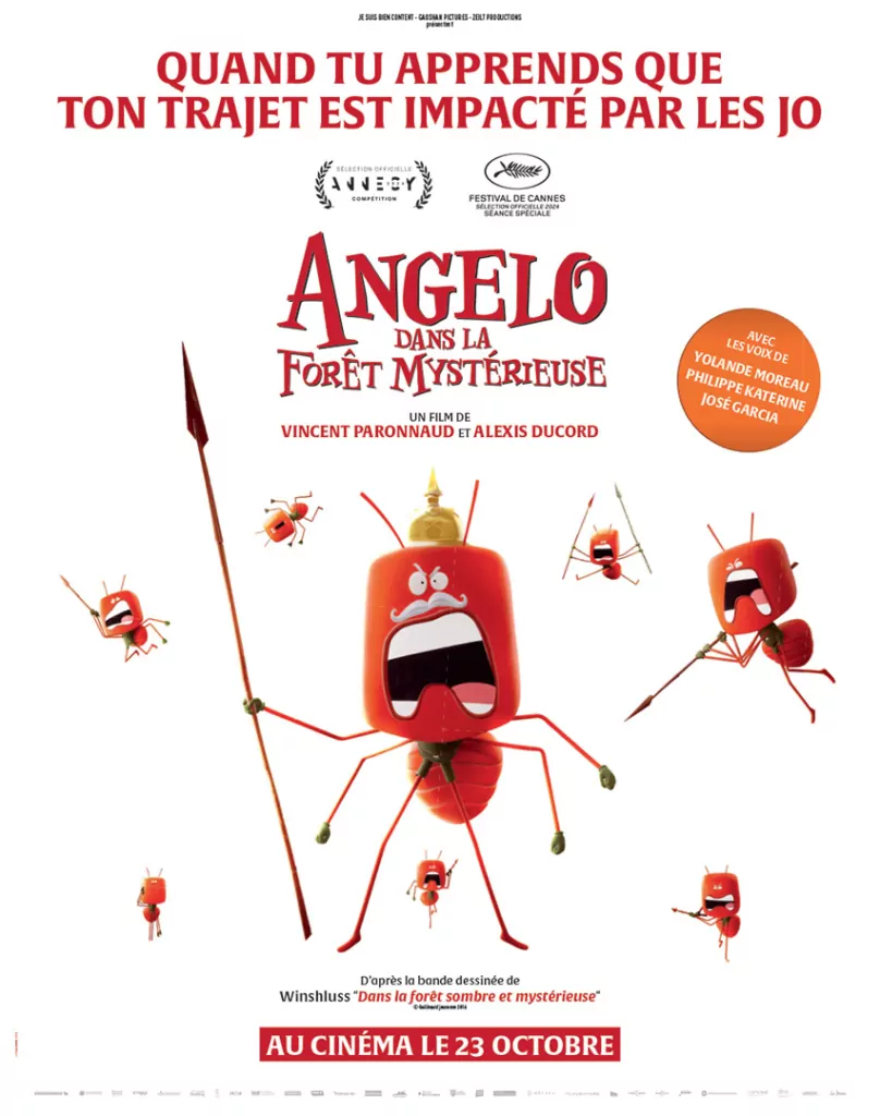 Affiche cinéma officielle du film d'animation "Angelo dans la forêt mystérieuse". Une affiche créé par l'agence Les Aliens. Un film adapté de la bande dessinée DANS LA FORÊT SOMBRE ET MYSTÉRIEUSE de Winshluss. Distribution du film en France par Le Pacte en octobre 2024.