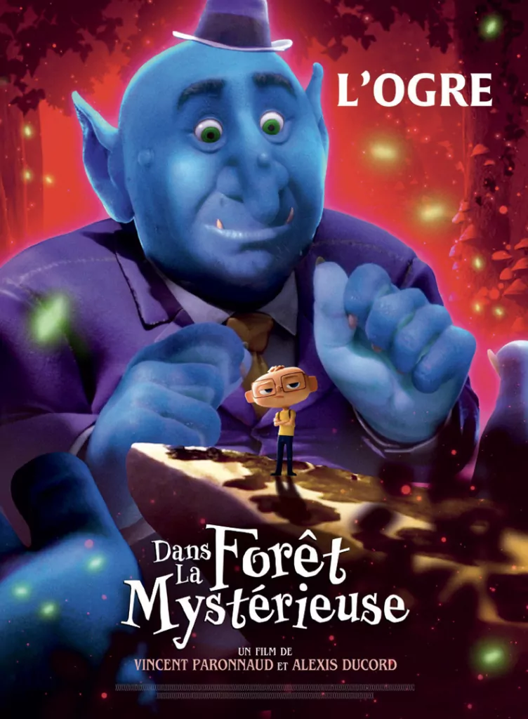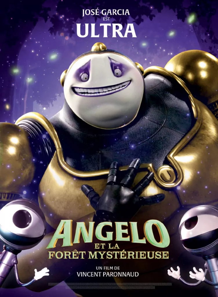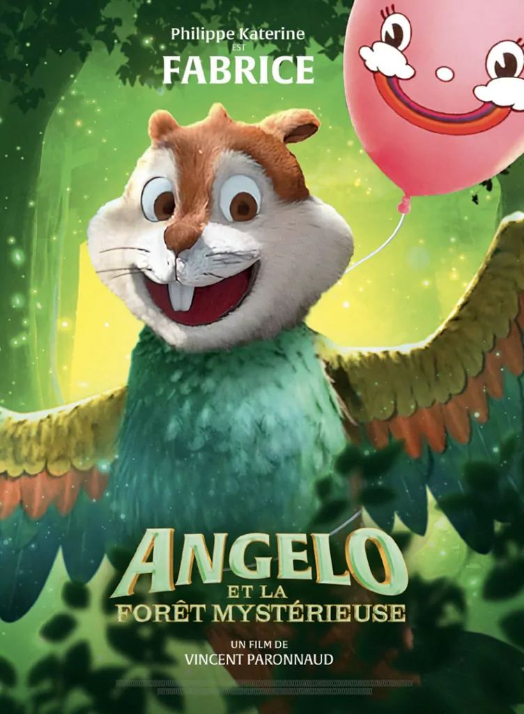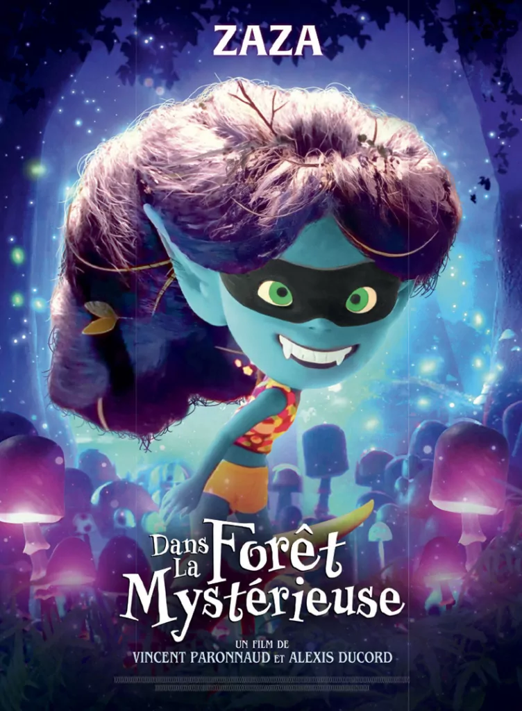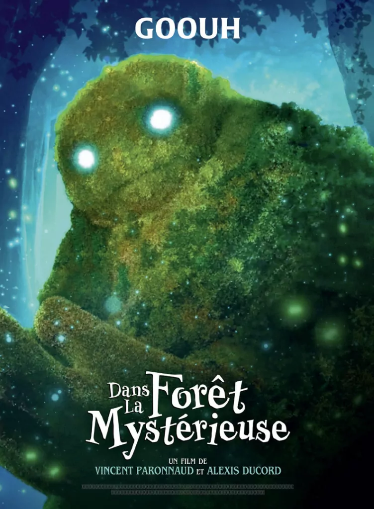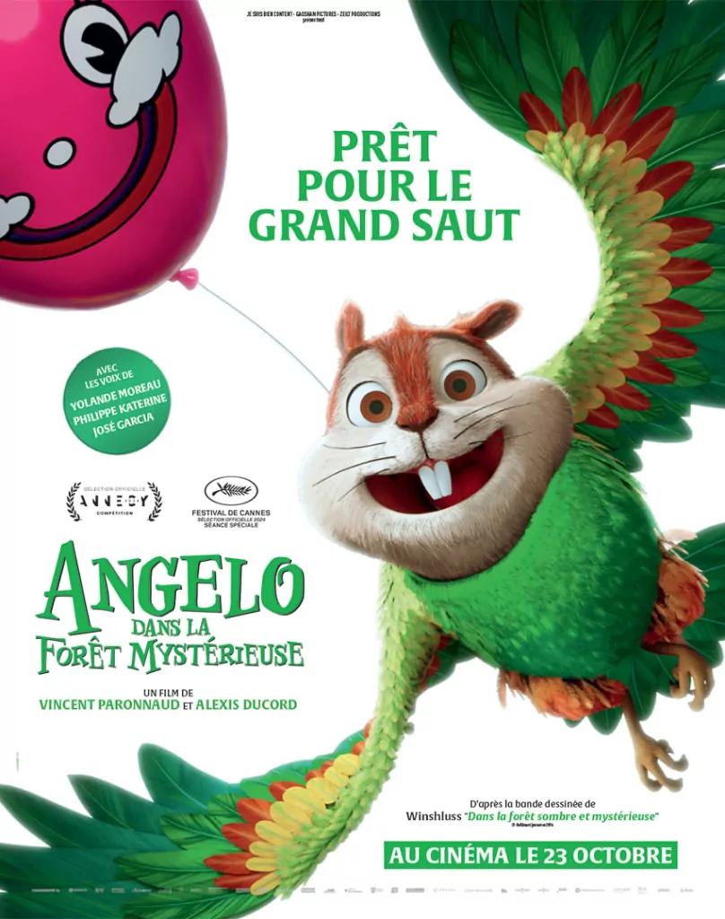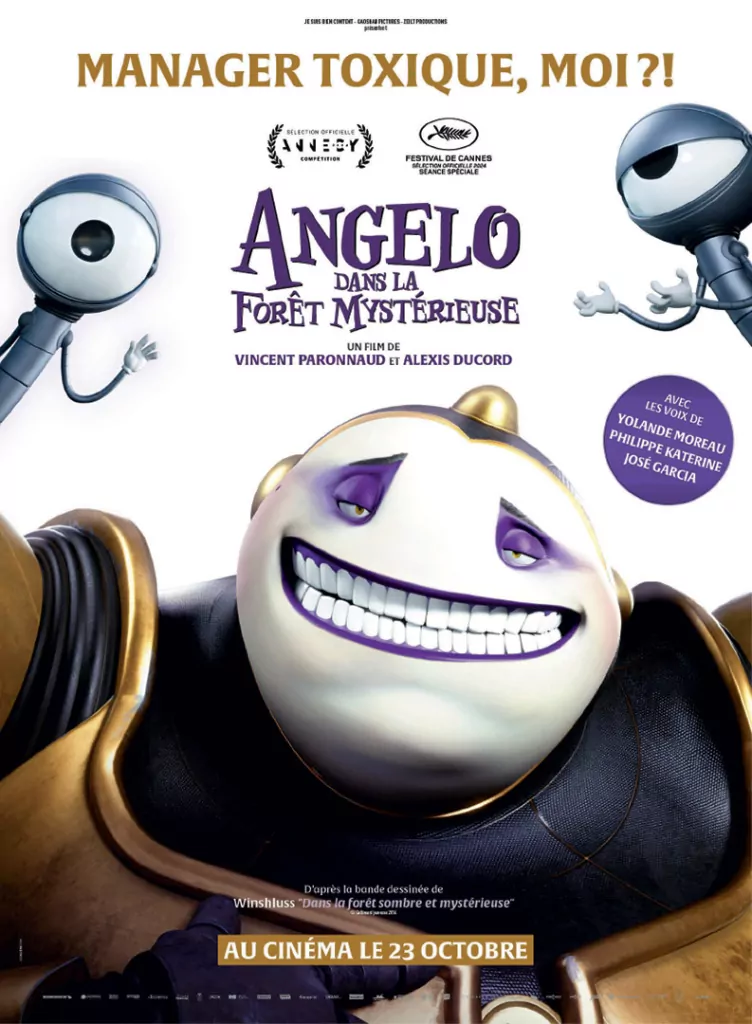 Affiche cinéma officielle du film d'animation "Angelo dans la forêt mystérieuse". Une affiche créé par l'agence Les Aliens. Un film adapté de la bande dessinée DANS LA FORÊT SOMBRE ET MYSTÉRIEUSE de Winshluss. Distribution du film en France par Le Pacte en octobre 2024.