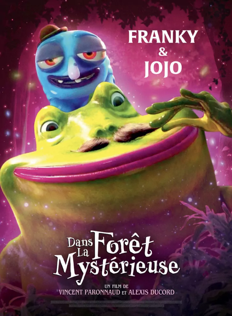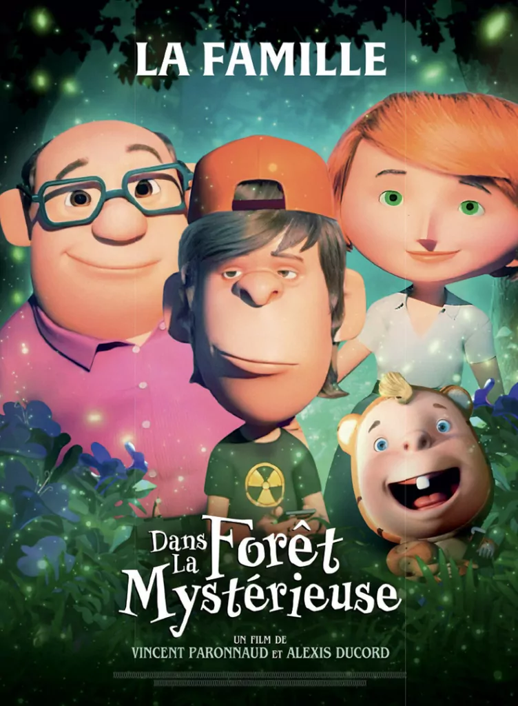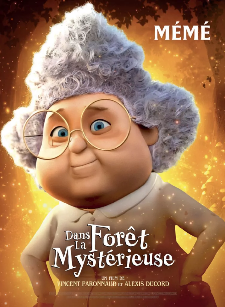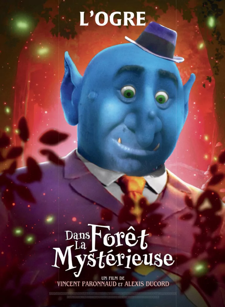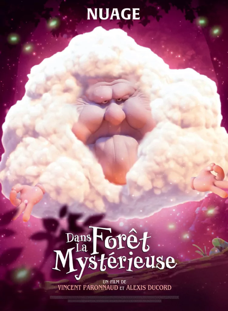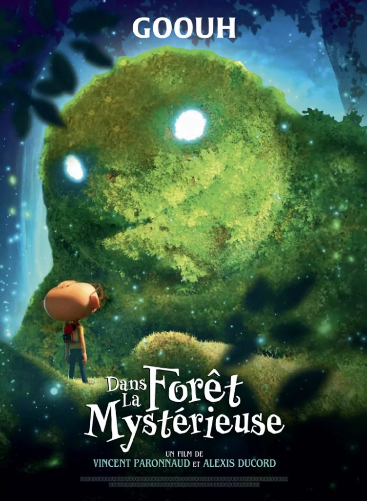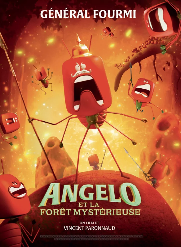Affiche cinéma officielle du film d'animation "Angelo dans la forêt mystérieuse". Une affiche créé par l'agence Les Aliens. Un film adapté de la bande dessinée DANS LA FORÊT SOMBRE ET MYSTÉRIEUSE de Winshluss. Distribution du film en France par Le Pacte en octobre 2024.