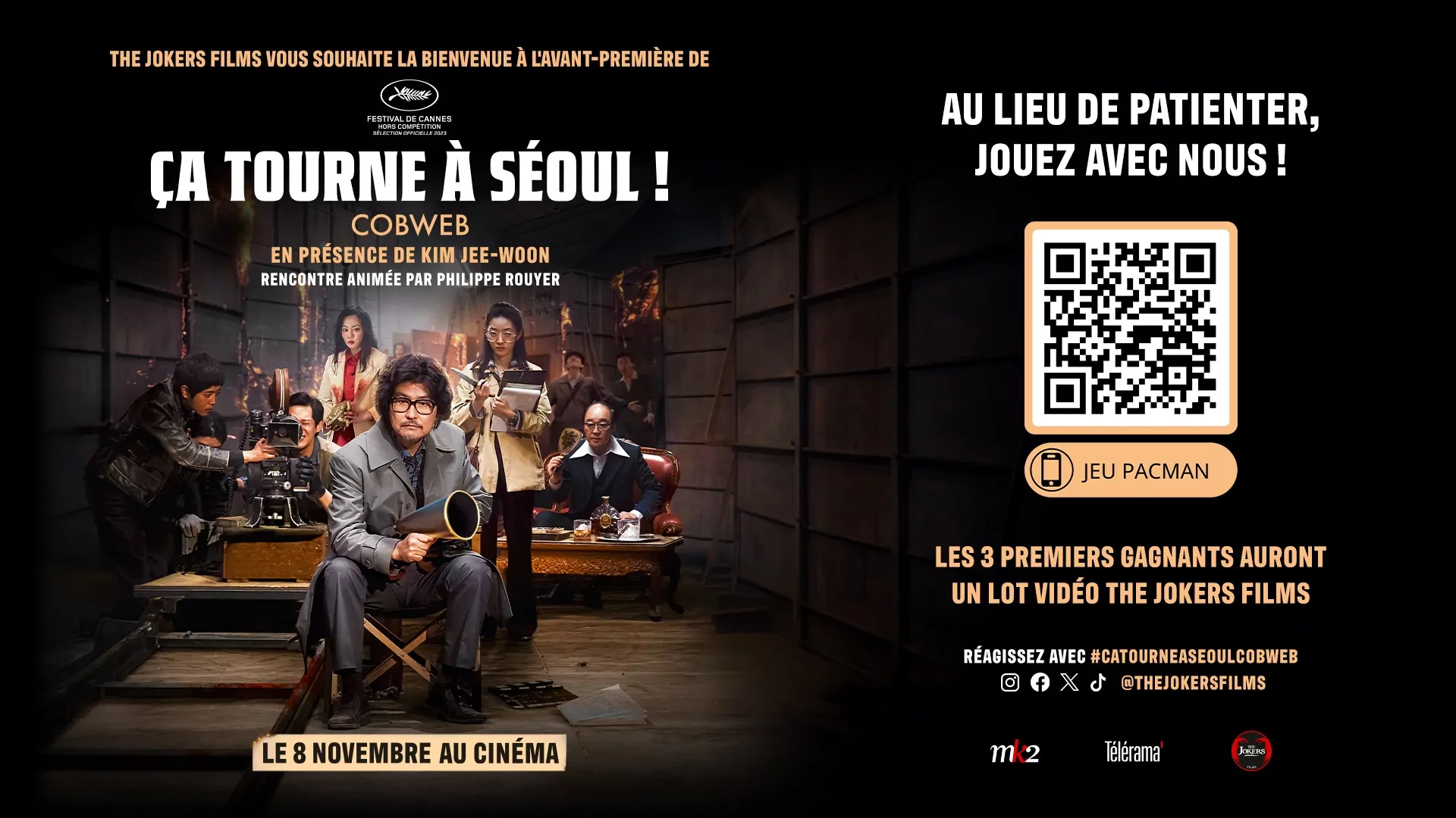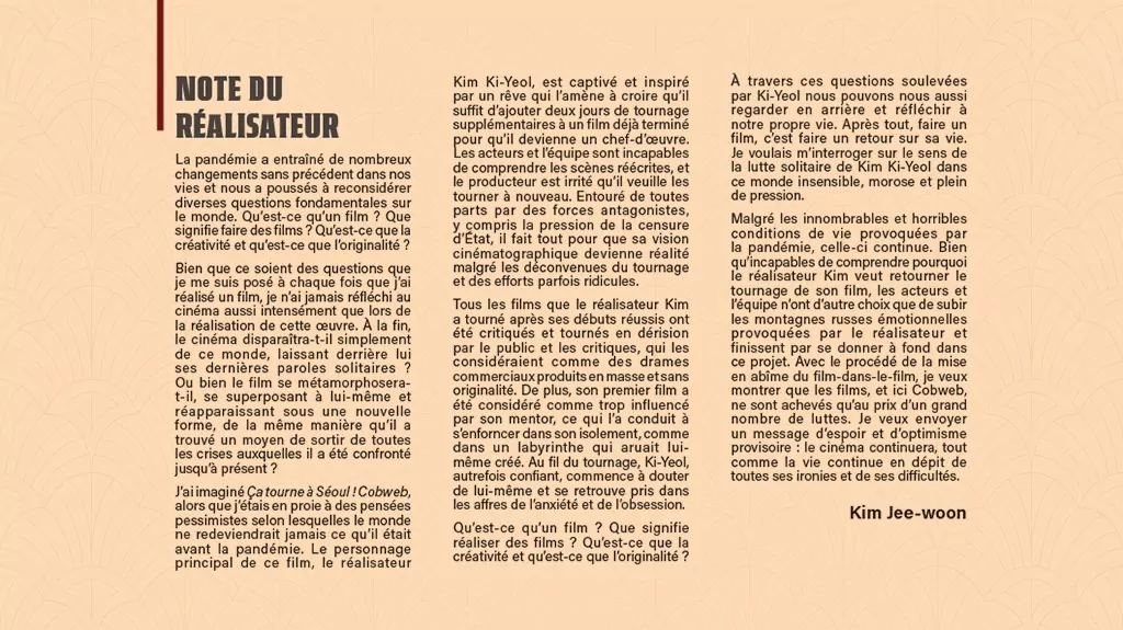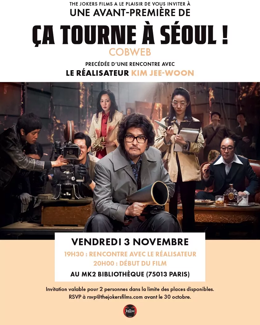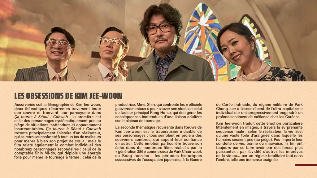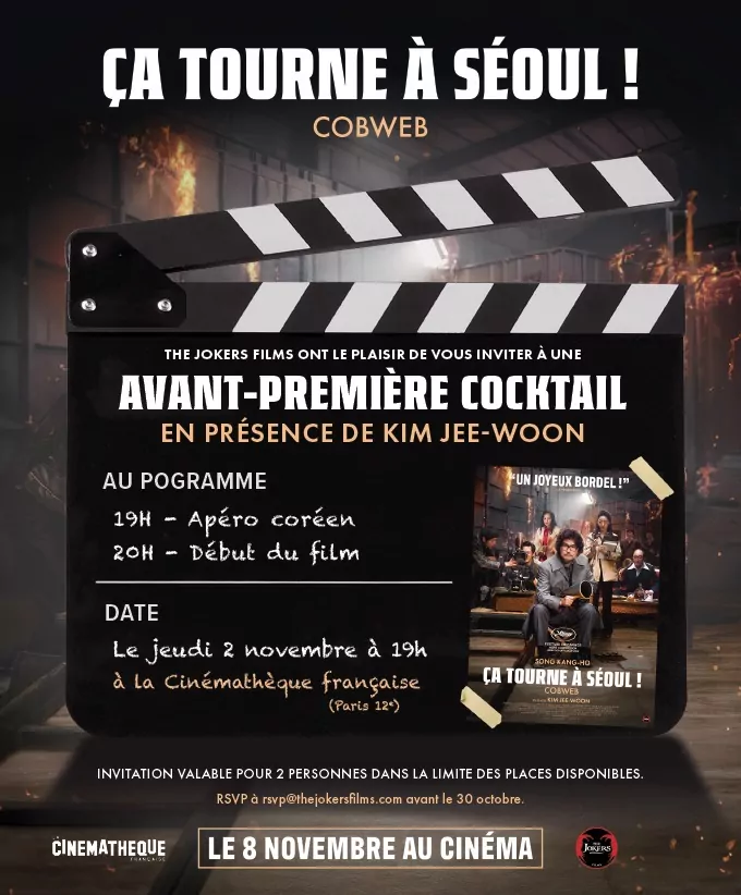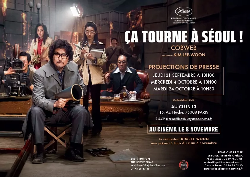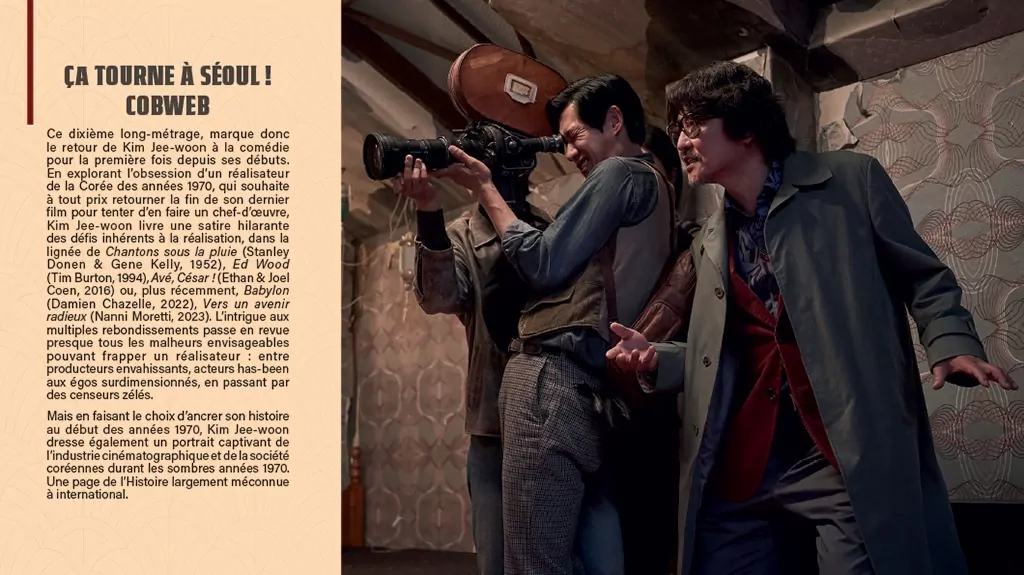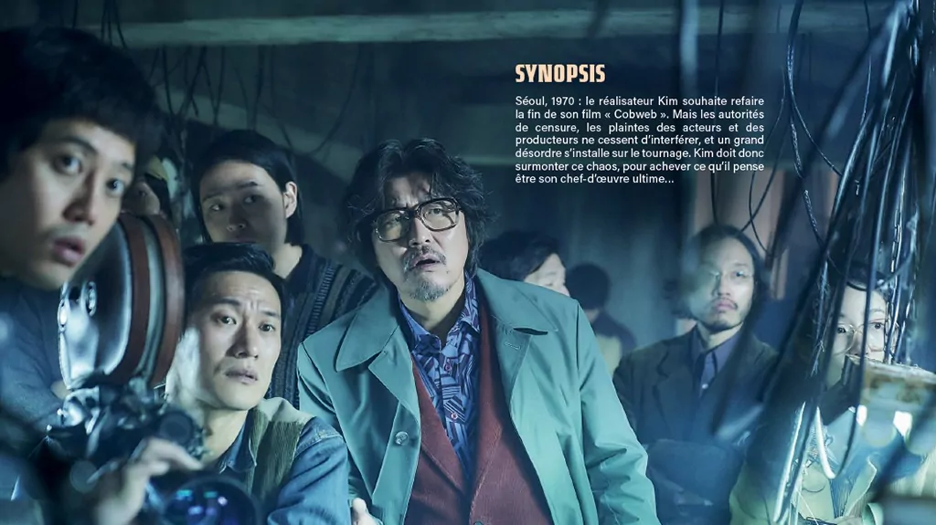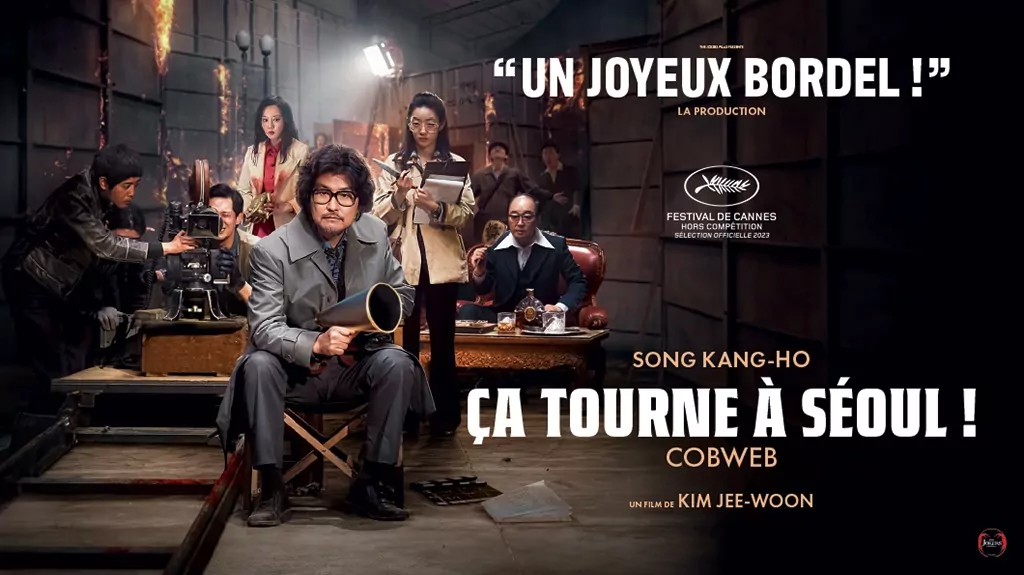 Filmer un tournage catastophe. Tel est le sujet du fabuleux « Ca tourne à Séoul » du réalisateur Kim Jee-Woo. Quelques mots du film pour mieux comprendre notre affiche : à Séoul en 1970, le réalisateur Kim (!) souhaite refaire la fin de son film « Cobweb ». Son chef-d’oeuvre ! Mais rien ne se passe comme prévu et le tournage se transforme en un incontrolable chaos.