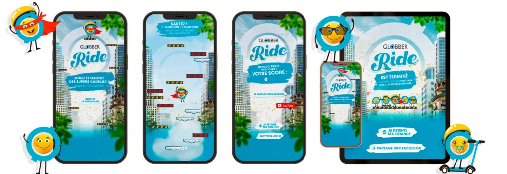 Développement de plusieurs applications pour stimuler l’engagement par des adaptations de jeux mondialement connus comme Doodle Jump par exemple pour cette appli « Globber ride ». Au delà du nombre de participations record, nous récupérons les adresses email de ces participants pour les fidéliser par l’envoi de newsletters aux contenus exclusifs.