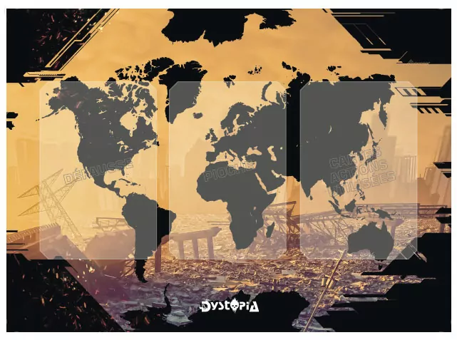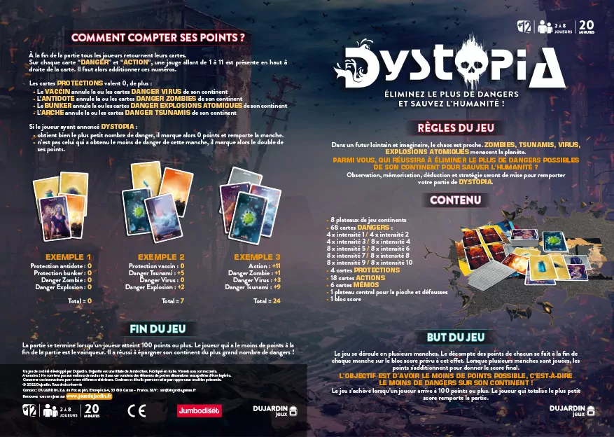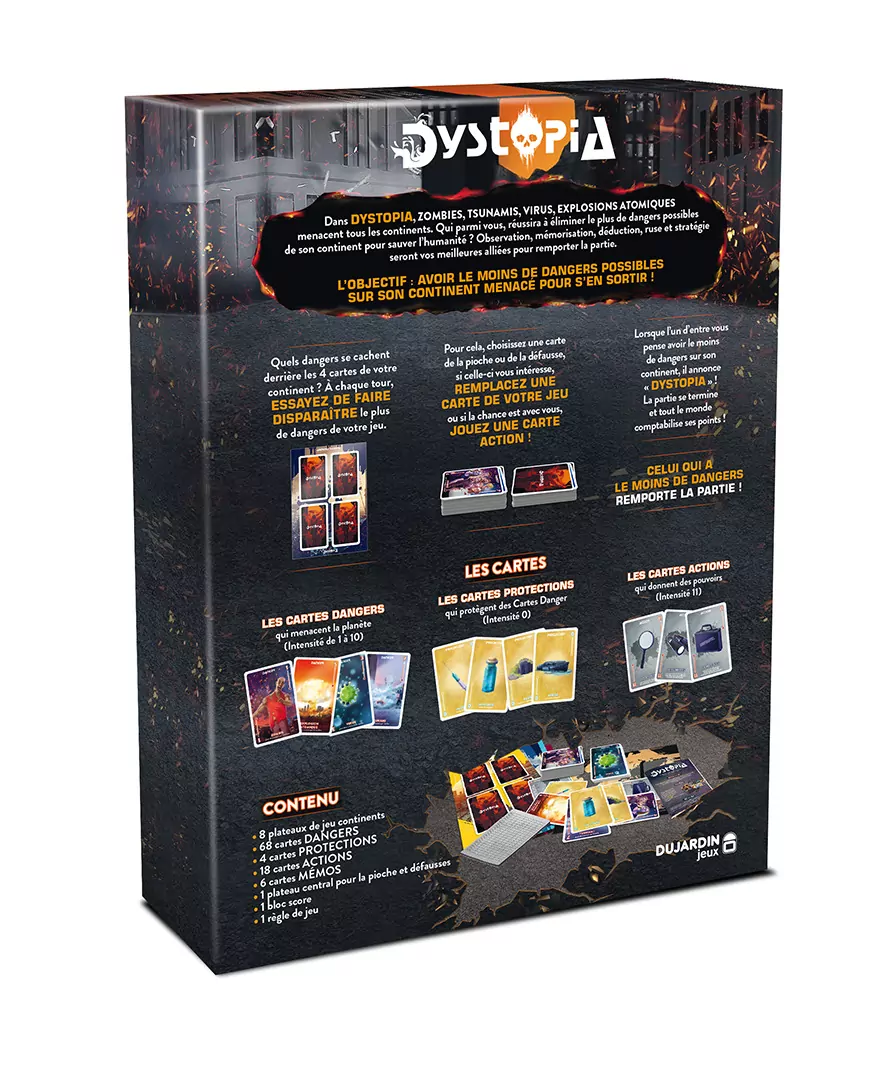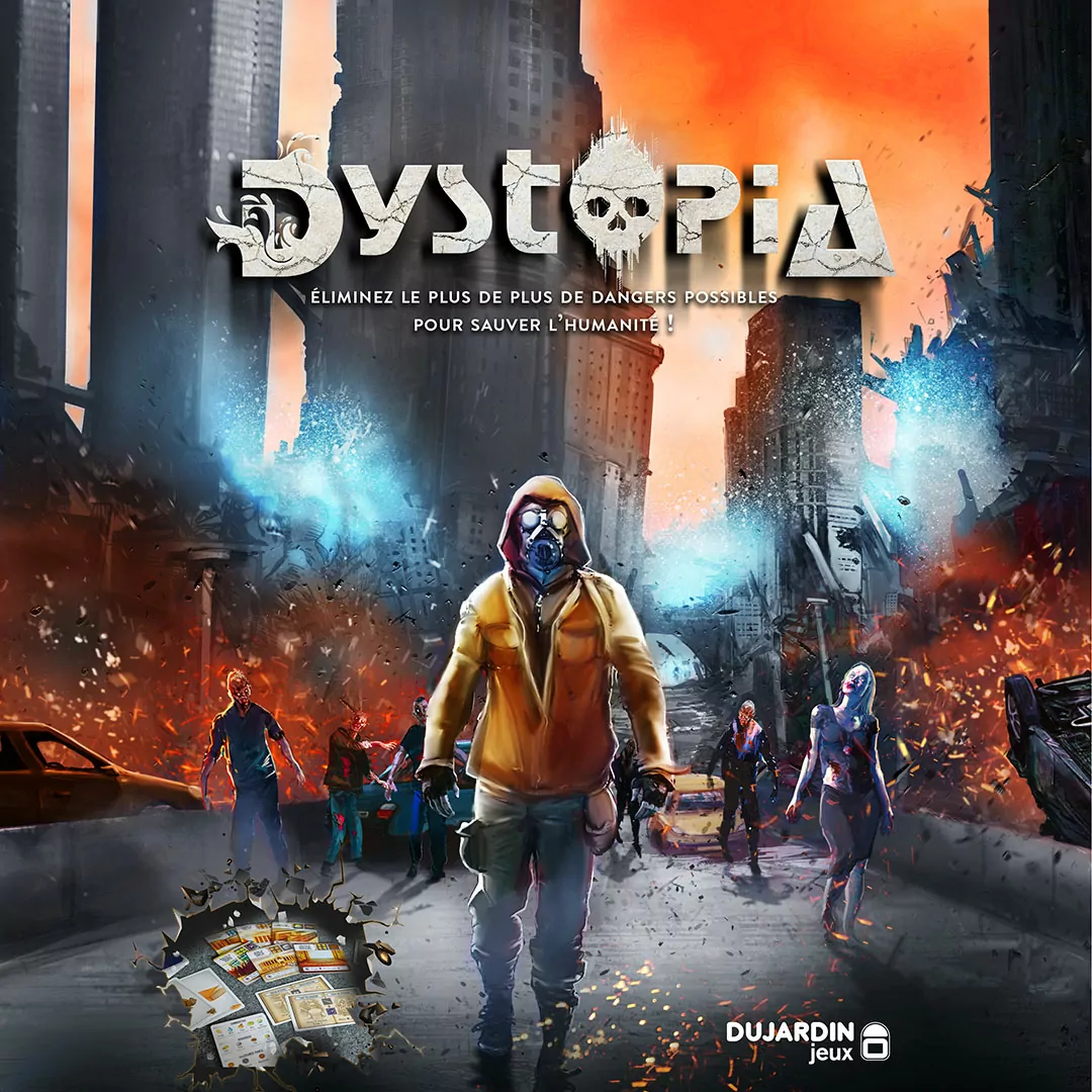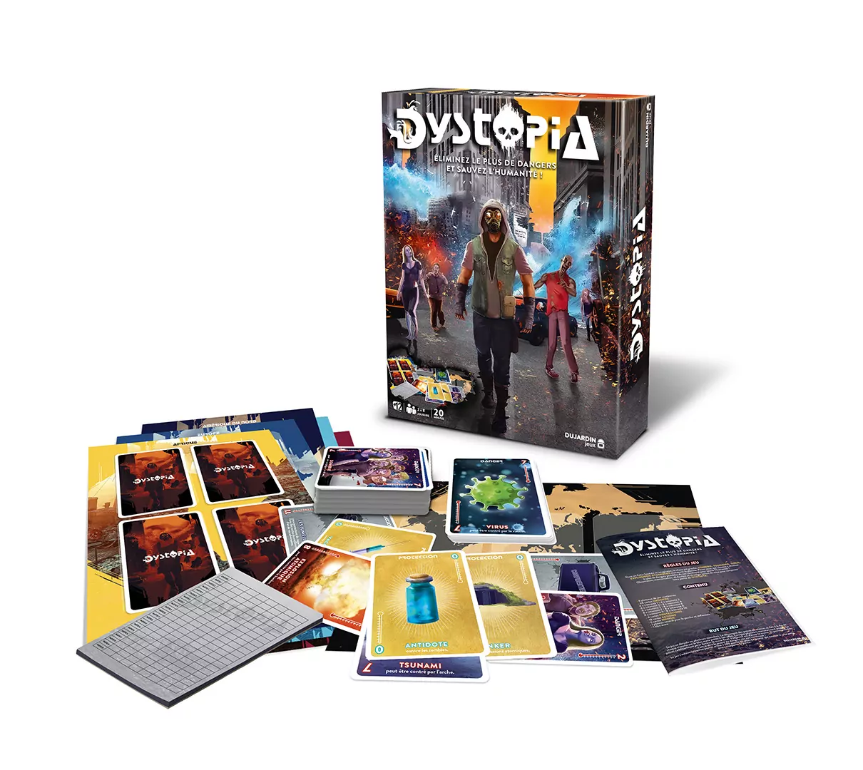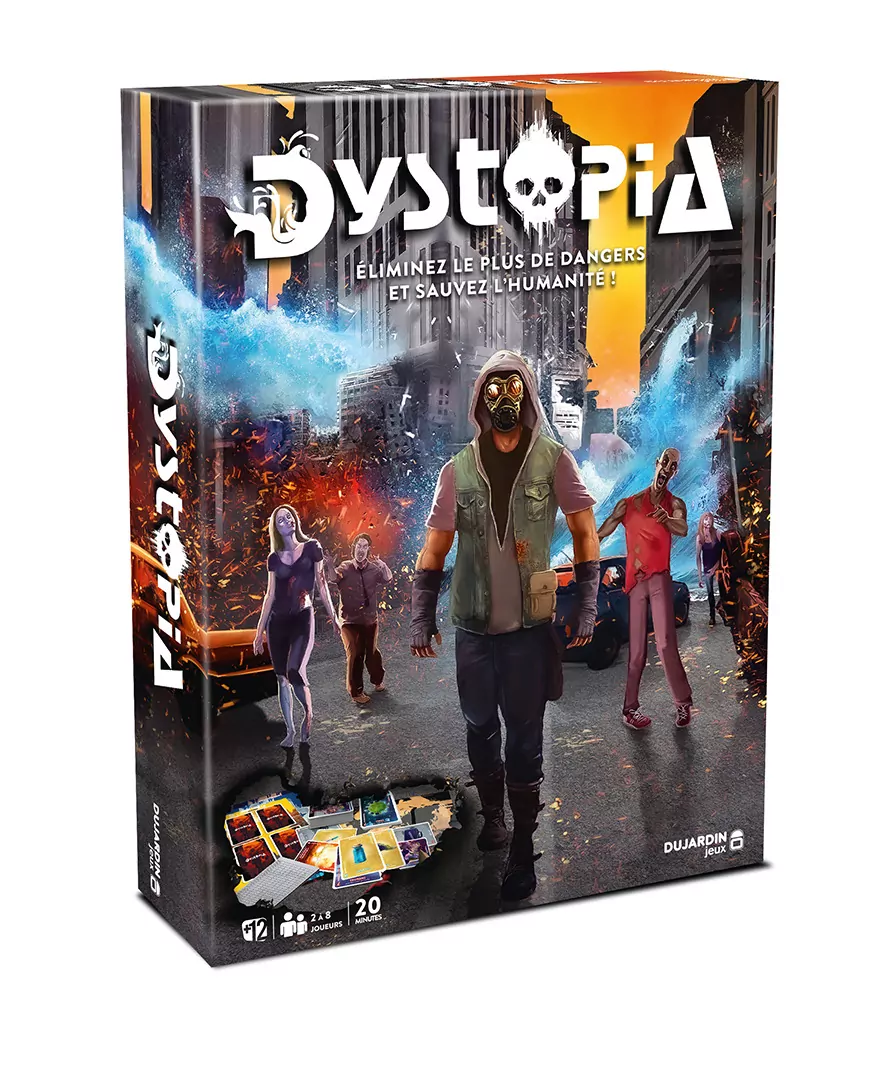 Dystopia est un jeu de société immersif sur le thème de la fin du monde imaginé par la marque de jeux Dujardin. Dans Dystopia, les joueurs vont lutter pour survivre et sauver l’humanité des dangers qui la menacent, et pas des moindres : virus plus ou moins virulents, tsunami dévastateurs, explosions atomiques ou invasions de zombies.