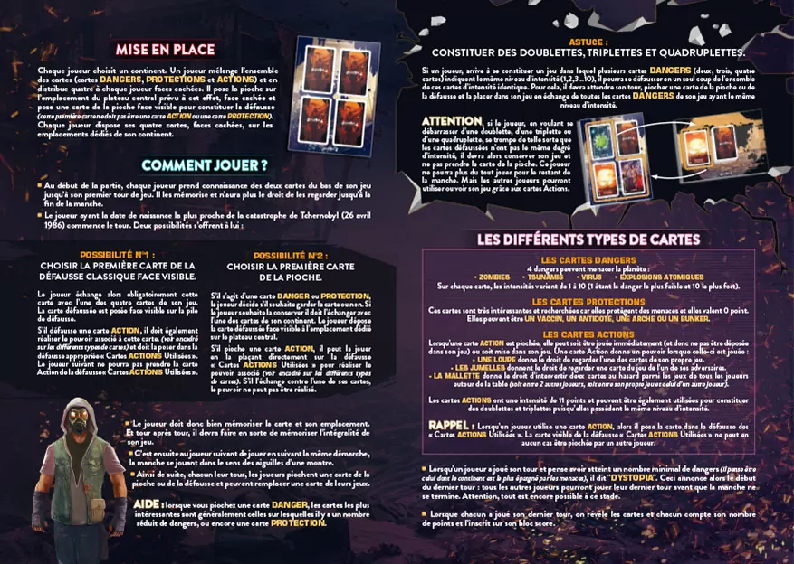 Le jeu nécessite 3 types de cartes différents : 4 modèles de cartes « jokers », 3 modèles de cartes « action » et 40 modèles de cartes « dangers ». Chaque danger – « virus », « tsunami », « explosion » et « zombies » – est décliné en plusieurs niveaux d’intensité, de 1 à 10. On vous montre les niveau 1 et 10.