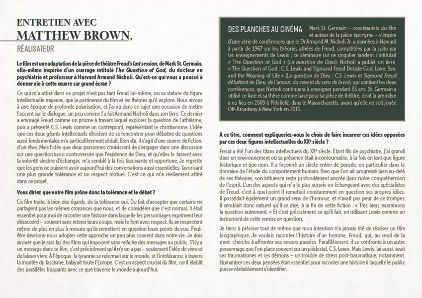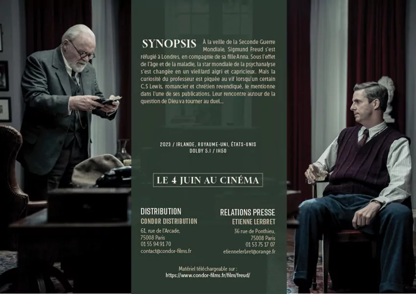 Avec son film « Freud, la dernière confession« , le réalisateur Matt Brown nous propose une rencontre imaginaire entre le père de la psychanalyse et le romancier C.S Lewis, auteur de Monde de Narnia, catholique revendiqué. Synopsis : Freud – alias Anthony Hopkins – et C.S. Lewis – alias Matthew Goode – se rencontrent à Londres, où le docteur s’est réfugié pendant le seconde guerre mondiale, et ils entament une discussion autour de l’existence de Dieu… discussion qui tourne au duel rhétorique. Le film se présente comme un drame historique et pourtant ce n’est pas un biopic 🙂