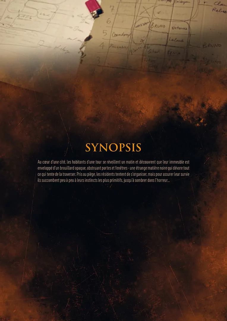 Synopsis : au cœur d’une cité, les habitants d’une tour se réveillent un matin et découvrent que leur immeuble est enveloppé d’un brouillard opaque, obstruant portes et fenêtres – une étrange matière noire qui dévore tout ce qui tente de la traverser. Pris au piège, les résidents succombent peu à peu à leurs instincts les plus primitifs, jusqu’à sombrer dans l’horreur…