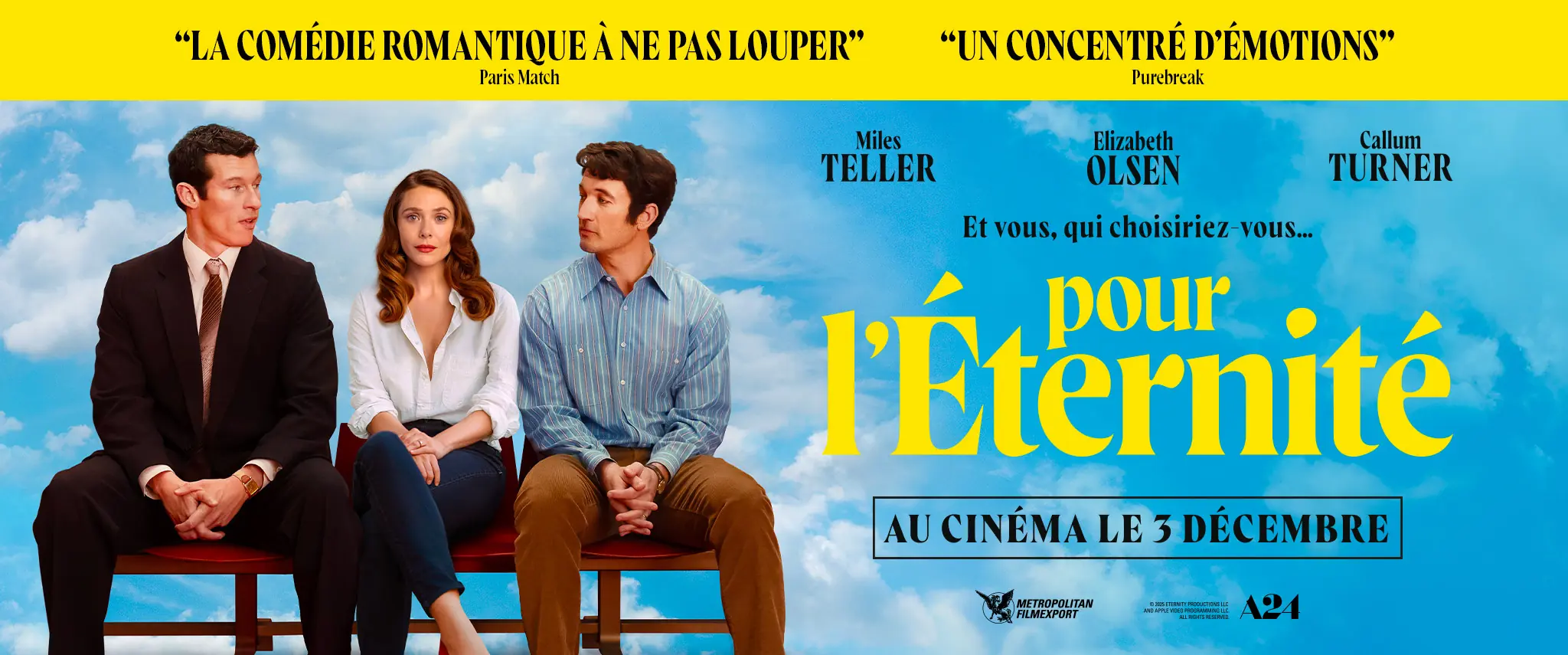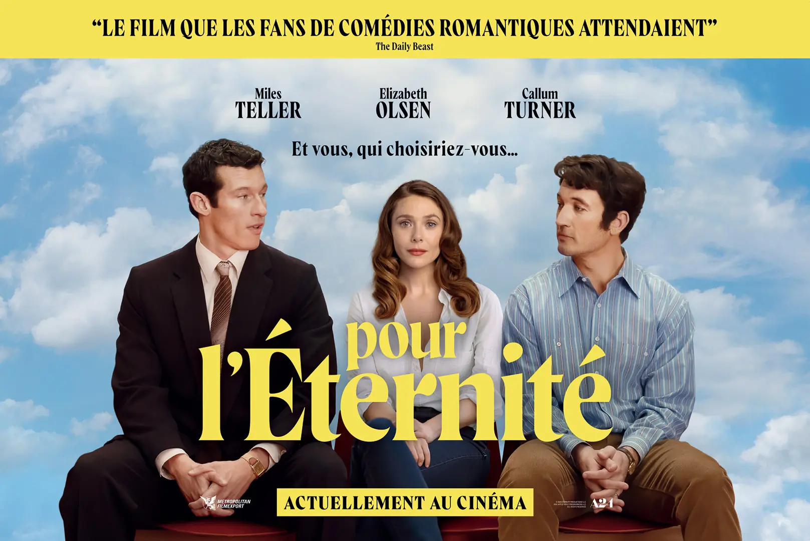 Affiche française du film "pour l'éternité" adaptée par l'Agence LES ALIENS. Une comédie romantique américaine de David Freyne, interprétée par Miles Teller, Elizabeth Olsen, Callum Turner.Film distribué en France par Metropolitan Filmexport en décembre 2025.
