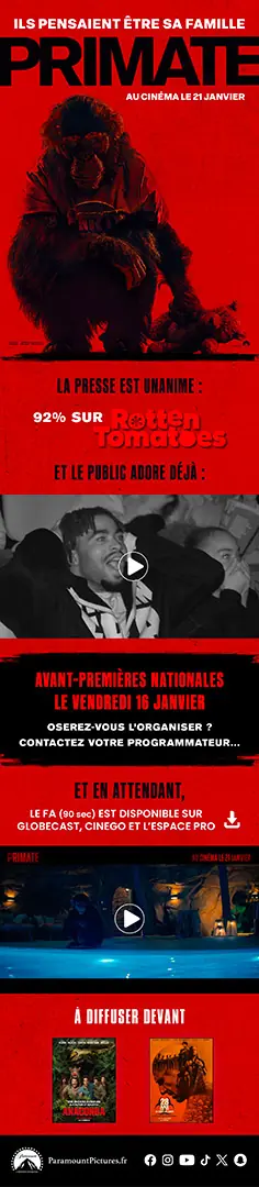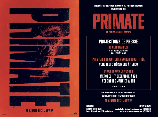 L’Agence LES ALIENS a localisé la campagne print & web du film d’horreur Primate distribué par Paramount Pictures France. Un film d’horreur de Johannes Roberts, ou un chimpanzé hors de contrôle transforme un séjour paradisiaque en cauchemar sanglant.